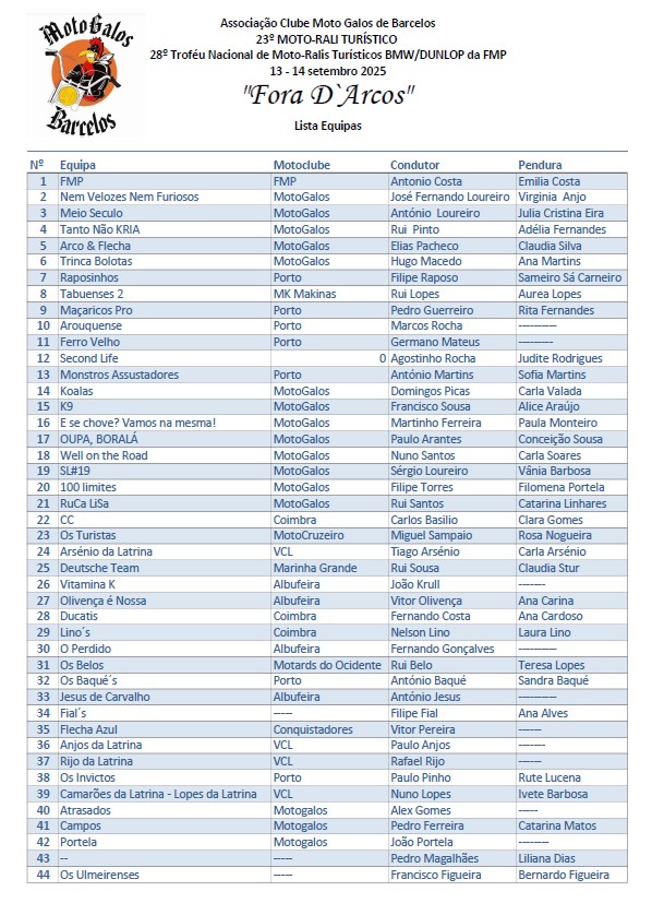 Lista de equipas inscritas para participar 23º Moto-Rali da Associação Clube Moto Galos de Barcelos